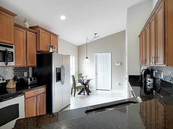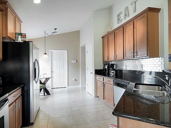 Beautiful contemporary lake view home in gated community. Bright open floor plan with 18'' tile, crown molding and vaulted ceilings. Eat-in kitchen offers granite counter tops, stainless steel appliances, and 42'' maple cabinets. Master bedroom boasts wood flooring, a master bath with double sink vanity, tiled shower, and large linen closet. Family room leads to patio where you can enjoy the lake views and exotic fruit trees. Home features double pane windows, hurricane shutters, paver driveway, front porch, and updated light fixtures. Like new, move in ready, one owner home! Perfect location to great schools, parks, and shopping.
