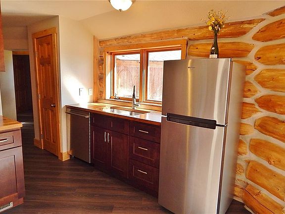 Very unique round log cabin BORDERING NATIONAL FOREST on one side, and Open Space on another. NEW roof, NEW flooring, NEW furnace, NEW bathrooms and NEW interior log chinking. Brand NEW kitchen cabinets, NEW appliances including a gas range, pantry and gorgeous NEW butcher block countertops. Cabin features solid wood 6 panel interior doors throughout, skylights, pull down stairs to access HUGE attic storage and an OS 1 car attached garage. Wraparound deck with beautiful views to Pikes Peak.