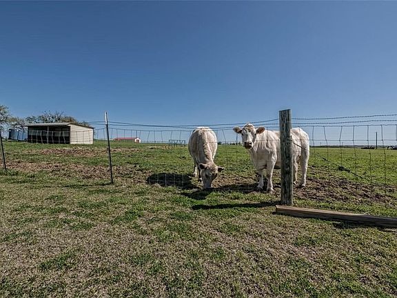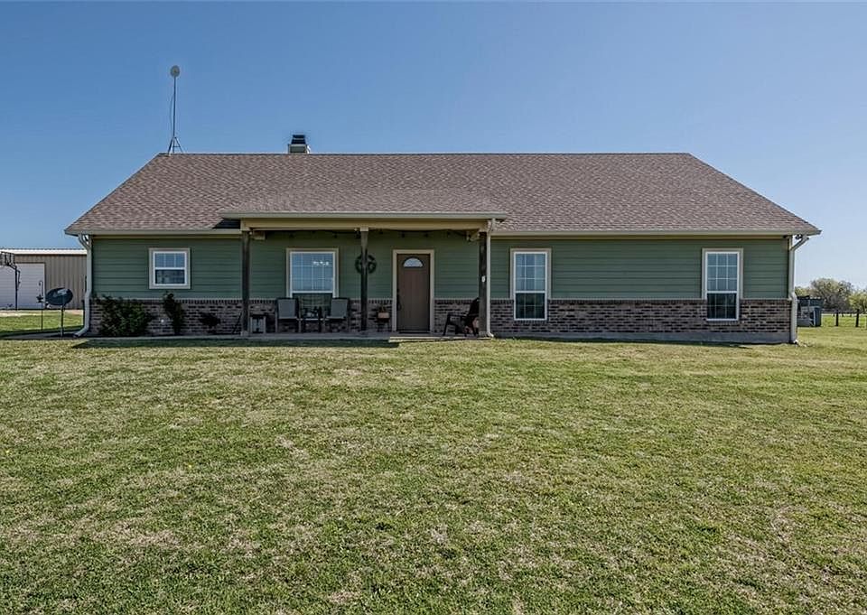Beautiful Ranch Style Home sitting on 9.4+/- acres with pond, stable, and shop! All located on a corner lot with access on two sides, fenced, and cross fenced. The shop is 20 X 30 with 12' garage door, half bath set up, windows, insulation, electricity, and even a 30 amp RV plug. There is also a 10 X 20 stall for livestock, chicken coop, and green house. The round pen, squeeze chute, hay rings, cattle trailer, and even the cows are negotiable. The pond is 13'+/- deep stocked with perch. The home features expansive front and back porches, open floor plan, formal dining, huge laundry room, an extra safe room, and more! This home is ready to go. You don't even have to bring the cows...it even has those!