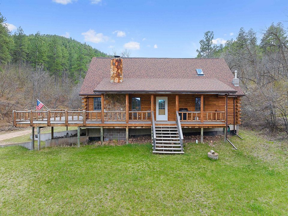 Are you looking for that picturesque Black Hills cabin home bordering National Forest Service land with all the privacy a person could ask for, but just not in living a lifestyle that has an extra hour to drive to the grocery store? This is the home you have been looking for that you feared didn't exist! This log home is nestled up against the trees at the corner of the 43+ acre lot (bordering Forest Service!) enjoying ultimate privacy, but a quick 5 minutes drive to I-90 Exit 34. The outside curb appeal is just what you want of a Black Hills cabin - both covered porch and open decks (yes, plural!), mossy rock chimney, beautiful rough hewn log exterior. Inside, you'll enjoy an open floor plan with exposed log trusses and a picturesque wood burning fireplace just begging for Christmas stockings to be hung. The sunroom, dining area, living room, and kitchen all occupy the common space with views of the beautiful Black Hills in every direction. 2 bedrooms and a full bath round out the main level. The loft is used as the primary bedroom with an ensuite bathroom (walk-in shower and double sinks) and walk-in closet. The romance just keeps shining through with a Juliet balcony off the primary bedroom. Downstairs, you'll find plenty of storage or an unfinished space for you to expand into. An extended drive-under 2 car garage (21x37) enjoys the protection for additional parking of the large deck above and space for a workbench and additional storage space.