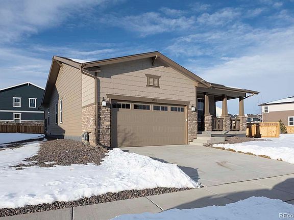 Welcome home to Painted Prairie! Denver's hottest new community featuring planned incredible open park spaces, soccer fields, and town center. Come view this fully completed move-in-ready and highly desirable ranch style 1532 floorplan with 4 bedrooms, 3 full and baths, with wrap around front porch, huge covered back patio, and full finished basement. Large 8,999 corner lot with full front, side, and rear landscaping completed! Too many upgrades to list including 9' foot ceilings, beautifully tiled walk-in primary shower, living room fireplace, stone countertops, double stacked cabinets, and vinyl plank flooring throughout the main level. You will love the flow and open concept of this home as well as the quiet south-facing location only 3 blocks to both the parks and trails and soon to be constructed town center. The Listing Team represents builder/seller as a Transaction Broker.