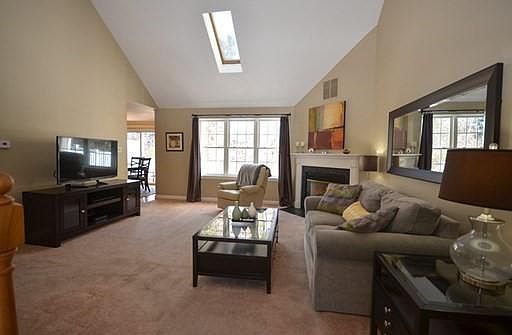 Welcome home to this bright townhouse at the popular and commuter friendly Woodburyville Heights. This unit is perfectly situated within the complex and abuts peaceful woodlands and walking trails. Once you enter the home, the soaring ceilings are there to welcome you with natural light and an open floor plan. The large family room has a cathedral ceiling, cozy gas fireplace and skylight. The family room leads into the kitchen which offers abundant cabinet space, a bar style peninsula and open views to the large hardwood dining area which looks out to the private composite deck. The first floor is complete with a half bathroom and laundry. The second level boasts a master bedroom with a walk-in closet that leads to a 'hollywood' style bathroom. The guest bedroom offer two closets and plenty of space. The bonus feature is the daylight, walk-out basement! It boasts a full walk-out and windows, recessed lighting, electric heating and so much space for living and storage.