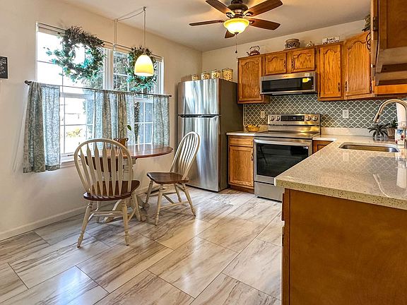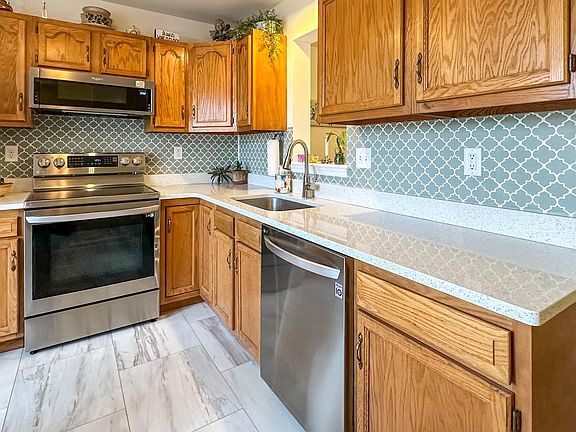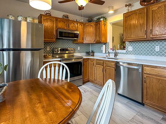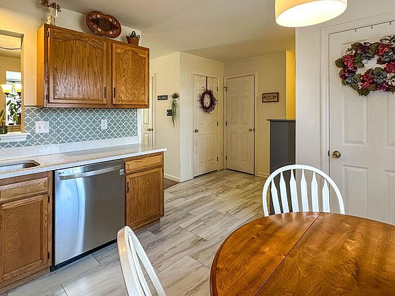 Welcome to this beautifully maintained home, where modern elegance and comfort come together seamlessly. As you enter, you're greeted by a spacious foyer featuring a newly added double closet for added convenience. The inviting eat-in kitchen boasts new quartz countertops, a deep stainless steel sink, and a new faucet, with all appliances being newer and ready for your culinary endeavors. The Kitchen Cortex Flooring is also new. The expansive living room offers a cozy space with a striking mantel, gas fireplace, and a unique accent wall, perfect for both relaxing and entertaining. From here, sliders with interior mini blinds lead to an expanded Trex deck, ideal for enjoying outdoor moments. The formal dining room provides an elegant space for meals and gatherings, while the two large bedrooms each feature their own full bath. The back bedroom is a true retreat, with a walk-in closet, cathedral ceiling, and recent bathroom upgrades. Additional highlights include a new roof in 2018, a water heater replaced in 2022, a new A/C unit in 2019, and gas HVAC for comfort throughout. Tilt-in windows and a larger front porch enhance both the functionality and charm of this wonderful home. With its thoughtful updates and inviting spaces, this property is ready for you to move in and enjoy.