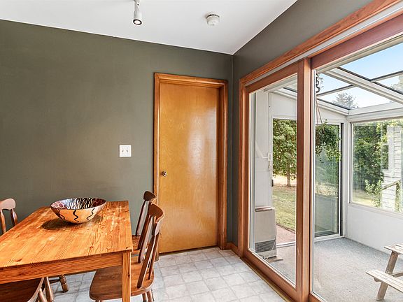 Cozy gas fireplace insertDining areaFantastic sunroomCharming brick patioConvenient coat closetMature landscapingRaised garden beds