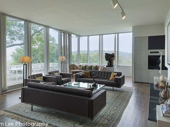 Sugar Loaf, Anthony's Nose and Castle Rock, along with the Hudson River are the superlative views from this modern masterpiece by architect Frank Dushin. 25 private acres envelop this dynamic design with a separate and private guest wing, panoramic windows and skylights, hardwood and Mexican terracotta floors, expansive terraces, in-ground pool and pool house.