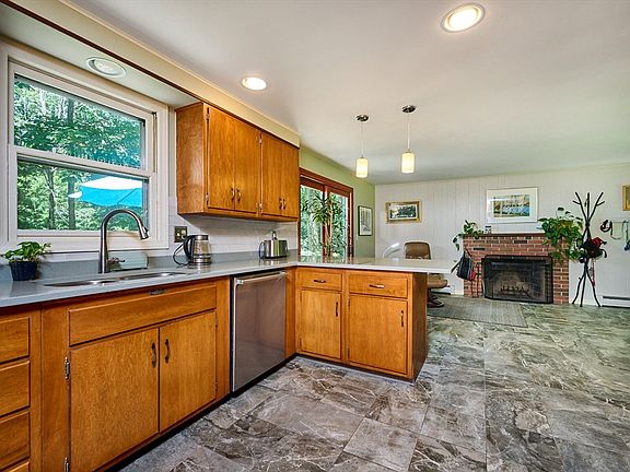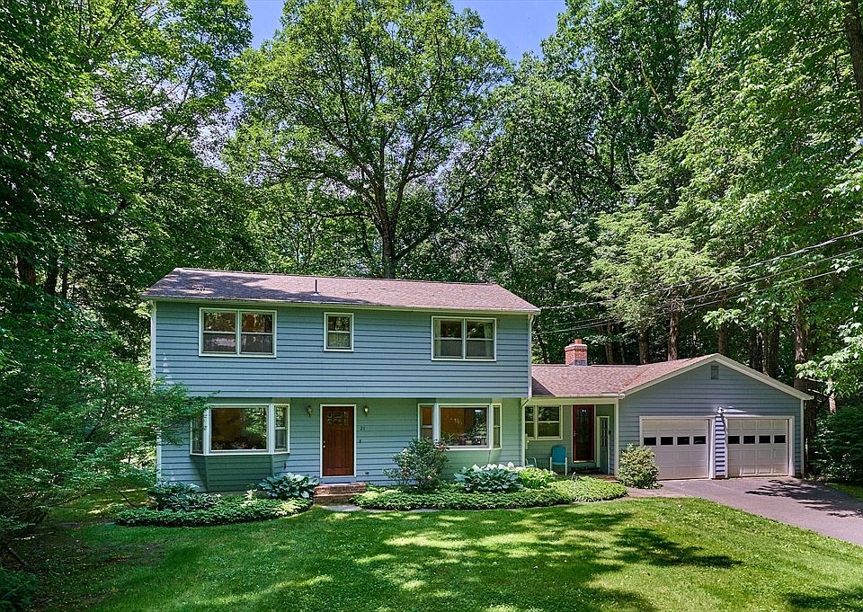 Welcome to this well maintained & move in ready home on beloved Arnold Rd! The Garrison Colonial, a New England favorite with 2nd story overhang adding space, comprises 4 bedrooms, 2.5 baths & two-car garage & is sited on 2.77-acre lot in Pelham. Enjoy the advantages of private, country-like setting w/ nearby small & coveted elementary school, along with a short commute to the Amherst Center, UMASS & reputed private Colleges. The side entrance brings you into an open floor plan w/ remodeled family room & kitchen. A wood burning fireplace (once w/ stove insert) provides a cozy hang out area in the winter & access to a west facing deck in the summer. Wood cabinetry w/ quartz counters, newer appliances, recessed lighting & tile floor deck out the kitchen. Inviting is the formal DR w/ bow windows. The LR is spacious & touts the same oak flooring found throughout. A half bath w/ laundry completes the main floor. Upstairs are the main bedroom w/ 3/4 bath, 3 more bedrooms w/ full bath
