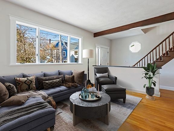 Welcome to this spacious Colonial, with a full in-law suite above the detached 2 car garage. The main home features beautiful hardwood flooring and fresh paint throughout. The first floor offers an open and bright living room, a half bath, formal dining room, and a nice sized eat-in kitchen, with access to the sunroom. Upstairs there are 2 generously sized bedrooms, a full bathroom, and a seating area that could easily be converted to another bedroom. The basement has a lot of potential for additional living space, or extra storage. The in-law suite above the garage consists of a kitchenette, full bath, washer/dryer hookups, vaulted ceilings with wood beams, and skylights! Off-street parking, and a private, fenced in backyard. Close to shopping, restaurants, parks, and more!