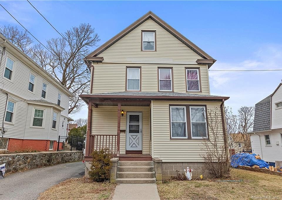 This oversized colonial with an open front porch is located on a quiet dead end street. Main floor boasts generously sized living room with beautiful original pocket doors that lead to the large dining area. Dining area gives way to kitchen which grants you access to the back porch. First floor half bathroom is off the dining room. The grand entry way is home to a beautiful staircase will lead you upstairs. Second floor has three bedrooms a full bathroom & office space. Third floor is home to two more bedrooms Much of this colonial’s charm still stands, solid wood doors & gorgeous wood trim. Updates include vinyl siding, replacement windows, water & sewer line to street, electrical to home, oil tank & furnace.
