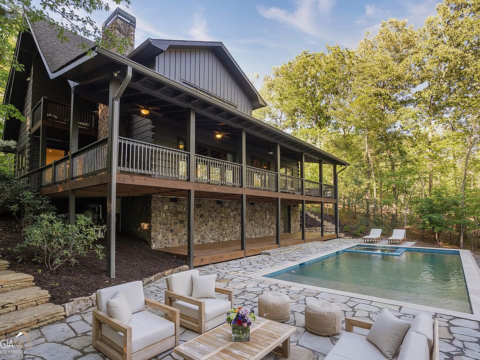 Impressive lodge style home with modern finishes and luxury appointments throughout, this stunning new listing on the shores of Lake Blue Ridge is less than five minutes to Downtown Blue Ridge w/ all paved access and is quite the show stopper! Complete with four bedrooms, three full and one half bath, gourmet kitchen w/ quartz countertops and stunning S/S appliances, large dining room, additional eat-in island, cocktail beverage area, open-concept living room w/ soaring beams and stacked stone F/P. Rough sawn hardwoods contour the entire home and bring both warmth and contrast to the modern sleek finishes. Bathroom suites feature large walk-in spa showers and vessel tubs, MOEN fixtures, and rustic cabinetry. On the exterior, find yourself gazing at Lake Blue Ridge from the stone deck of the gorgeous heated pool and jacuzzi combo. Gorgeous landscaping w/ grassy backyard area and hardscaped steps around the perimeter of the property make the property feel like a resort. Outdoor fireplace completes the space for nights outside; at the water, listing is complete with a single slip one level dock and easy access to and from the lodge. Sold fully furnished, this listing won't last long! Call today.