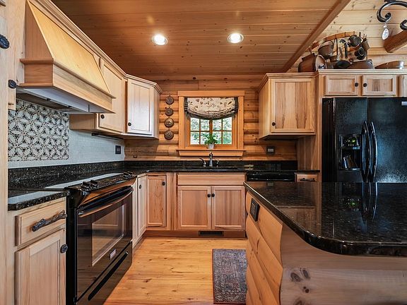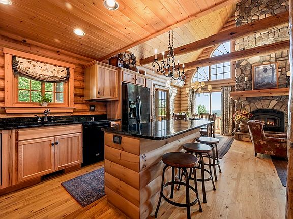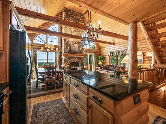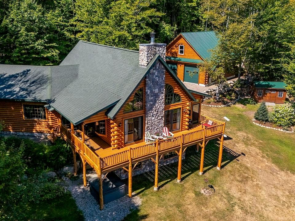 GOLDEN EAGLE LOG HOME WITH MOUNTAIN VIEWS ON NEARLY SIX ACRES. This custom-built log home offers over 2,800 square feet of living space across three levels, blending the warmth of natural wood with abundant light and thoughtful details throughout. The main level features an open kitchen, dining, and great room with vaulted ceilings, exposed beams, and a striking floor-to-ceiling stone hearth with fireplace, all framed by mountain views. Two bedrooms and a full bath complete this floor. Upstairs, a lofted study leads to the private primary suite with walk-in closet and full bath. The finished, walk-out lower level offers a spacious living room with gas stove, large windows that capture the views, a cozy retreat nook, ¾ bath, and laundry room. Practical features include a mudroom entry, attached two-car garage, and an oversized detached heated garage with finished space above—ideal for a studio, office, or guest accommodations. Outdoor living is a highlight, with a wraparound deck, covered entry porch, and screened porch off the dining area. A hot tub and stone patio with firepit overlook the meadow and the sweeping views of Pleasant Mountain. Privately set within the Fryeburg Academy school district, the home is just a short drive to North Conway and the White Mountains, and just over an hour to the Maine coast.