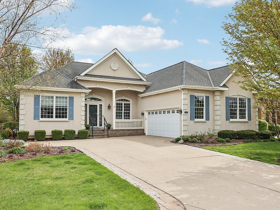 Welcome to this exceptional ranch-style home, where comfort and elegance meet! Step through the foyer into a stunning Great Room with soaring ceilings, a beautiful fireplace, and eye-catching floating shelves. The formal dining room is perfect for hosting, while the dedicated home office offers peaceful views of the front yard. The gourmet kitchen features 42" cabinets, stainless steel appliances, and a charming breakfast nook that flows seamlessly into the Great Room. Welcome to this exceptional ranch-style home, where comfort and elegance meet! Step through the foyer into a stunning Great Room with soaring ceilings, a beautiful fireplace, and eye-catching floating shelves. The formal dining room is perfect for hosting, while the dedicated home office offers peaceful views of the front yard. The gourmet kitchen features 42" cabinets, stainless steel appliances, and a charming breakfast nook that flows seamlessly into the Great Room. You will enjoy the bright and airy sunroom. The spacious primary suite offers a spa-like bath and an oversized walk-in closet. A well-appointed second bedroom makes an ideal guest retreat. The finished lower level is designed for entertaining, featuring a large family room with a home theater projector, a wet bar, a third bedroom, and a full bath-plus abundant storage and a workshop area. Outside, enjoy the beautifully landscaped corner lot from the expansive deck with a built-in gas hookup for your grill. Located in a gated community with resort-style amenities, including a clubhouse, fitness center, and pool-this home truly has it all! The spacious primary suite offers a spa-like bath and an oversized walk-in closet. A well-appointed second bedroom makes an ideal guest retreat. The finished lower level is designed for entertaining, featuring a large family room with a home theater projector, a wet bar, a third bedroom, and a full bath-plus abundant storage and a workshop area. Outside, enjoy the beautifully landscaped corner lot from the expansive deck with a built-in gas hookup for your grill. Located in a gated community with resort-style amenities, including a clubhouse, fitness center, and pool-this home truly has it all!