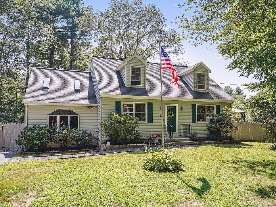 A financing fail = opportunity for you!! Set back on a quiet road, surrounded by nothing but trees, you will find this one owner, well loved, and meticulously maintained, spacious 4 bed/2 bath Cape! Step inside to a warm, inviting dining room that opens directly into the beautifully renovated kitchen! The sunken family room is filled with natural light from the large windows and skylights in the cathedral ceiling! The primary bedroom, bath and another bedroom currently being used as an office completes the first floor. Upstairs you will find 2 good sized bedrooms and another full bath! A fully fenced in yard, with aboveground pool, pool deck, and plenty of space for anything else you can imagine, creates the perfect outdoor oasis! This house is perfect for entertaining or to just have morning coffee out on the deck! Perfectly sized and perfectly located! Quiet and peaceful, yet minutes to major routes and the MA line. This property has it all!