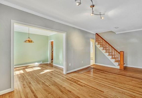 Back on market due to Buyer's finances. Charming home recently renovated on a quiet side street with minimal thru traffic. The farmers porch and deck invite you to enjoy the outside and the flexible floor plan allow for your individual requirements inside the home. Updated kitchen with stainless steel appliances has a breakfast bar plus space for table and chairs . There is also a separate dining room for those more formal occasions that opens to the sitting room. Large master bedroom on the ground floor has access to the deck. This room could be used as a family room. New half bath has pedestal sink and wainscoting. Second floor offers three bedrooms and an updated full bath. One bedroom has abundant additional fitted closets and is currently used as a large walk in closet. Hardwood through most of the home. Newer roof ,deck, porch, heating system and windows.Freshly painted throughout. Move in ready!