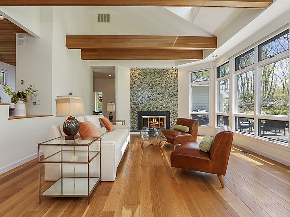 Retreat to a world of serenity and sunlight in this impeccable, recently updated home with pool on a private landscaped property. This is no ordinary home, it's one designed with elements of nature throughout connecting luxury interiors to its beautiful natural setting. From the custom riverstone island and nature-inspired backsplash in the gourmet chef's kitchen - fully outfitted with high-end stainless steel appliances -- to the stunning natural stone fireplace, this home is a perfect marriage between custom high-end interiors and the beautiful natural surroundings. Enter this special home and immediately be drawn to the wall of windows, and the soaring living room ceilings. First floor master is a dreamy escape with its new fireplace and spa bath featuring custom-designed shower and soaking tub and lovely Chinese antique vanity. Double walk-in closets make this master suite as functional as it is beautiful. Flexible floor plan includes an additional 2-bedroom suite on the first floor and 2 more bedrooms on the second level, either which would make a great teen/in-law/au pair suite. This is a one-of-a-kind property not to be missed. Note this beautiful home also has the lowest taxes in its price point. Central location provides easy access to schools and to Weston Center, Westport, Wilton and Georgetown for train, shopping, restaurants and services. School bus stops at the end of this private road.