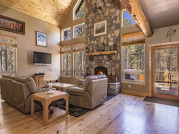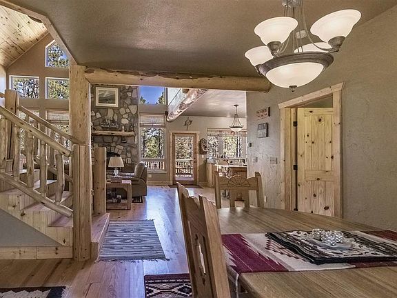 Beautiful mountain home built on double lot with large garage and new external storage building. Expanded driveway accommodates multiple vehicles including RVs. Tastefully landscaped. Versatile floor plan with masted and living downstairs. Two bedrooms upstairs plus two living areas. The perfect home for a full time family or as a vacation escape.