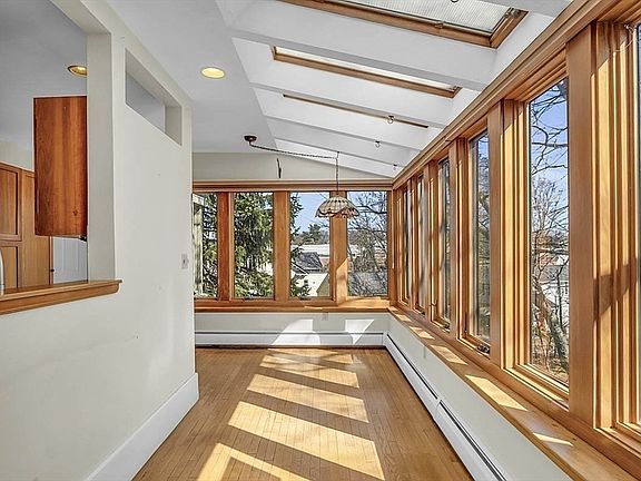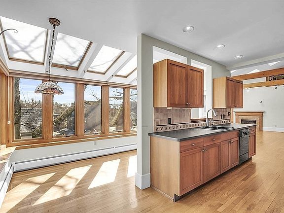 In the heart of Jamaica Plain awaits an exquisite stately Mansard Victorian home serving as your oasis. A classic home with modern elegance throughout. The 3rd floor offers a spacious open floor plan accented by custom millwork & soaring cathedral ceilings, skylights, two fire places, and built-ins. The refined vestibule opens to the living/dining area, which seamlessly flows into the eat-in kitchen. The kitchen has plentiful counter space and cabinetry, Not to be missed is the sun room off the kitchen overlooking the downtown area, or enjoy the city views from your private roof deck. The second level, there are 2 bedrooms with beautiful wood built-ins, a fire place, bay windows and a full bathroom. The finished lower level includes a full bath, a sauna and provides ample space for a family room, office, or home gym. 1 off-street deeded parking space. A couple blocks in any direction and you're sure to run into your next favorite restaurant, coffee shop, or boutique.