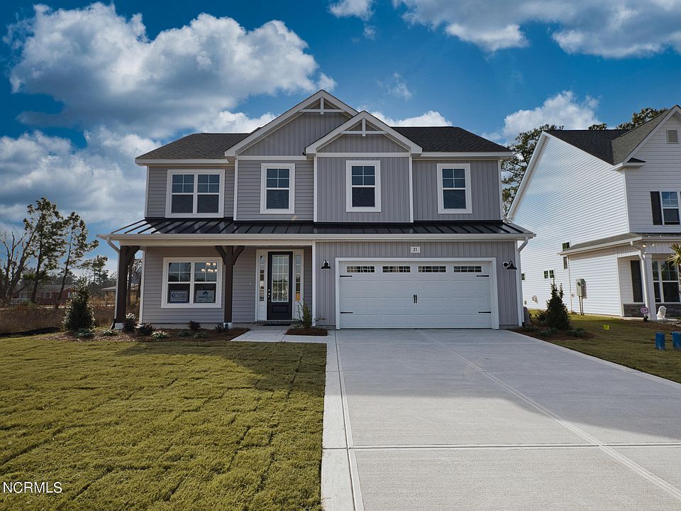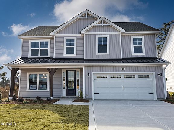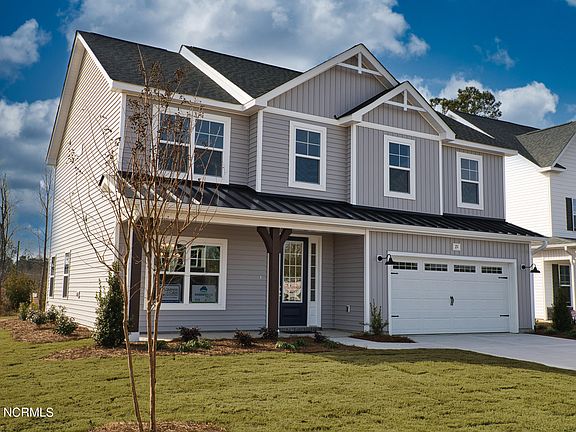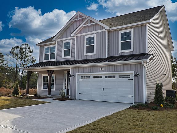 Move-In Ready! Welcome home to The Drayton by Caviness & Cates on a private cul-de-sac, corner lot in The Sanctuary at Forest Sound. This 2-story home includes 4 bedrooms and 2.5 baths and nearly 2400 sq ft of living space. The welcoming foyer adjoins the formal dining room with coffered ceilings and picture frame wainscoting. Across the back of the home, offering plenty of natural lighting, is the open kitchen, breakfast and great room with natural gas fireplace. The kitchen will showcase timeless Seattle ''Snow'' shaker cabinets, quartz countertops in ''Frost White'', natural stone mosaic backsplash in ''Carrara'', center island, corner pantry with wood shelves, and stainless steel appliances, including a natural gas range. All bedrooms are privately tucked away upstairs. The primary suite includes a fully tiled 6-foot walk-in shower with bench, double vanities, linen closet and large walk-in closet with custom wood shelving. Finishing out the 2nd floor, you will find 3 additional spacious bedrooms, a full bathroom with double vanity, laundry room with cabinets and an additional loft/living area at the top of the stairs. Additional features in this home include LVP flooring in the kitchen, great room, dining area and foyer, crown molding in the foyer, great room and kitchen, wainscoting in the foyer and up the stairs, oak tread stairs, epoxy garage floor, tankless natural gas hot water heater and gas HVAC. Enjoy the outdoors on your large, covered porch with extra grill patio and sodded and irrigated yard with rain sensor. The Sanctuary at Forest Sound is a brand-new community centrally located in the heart of Hampstead. 15 minutes to Wilmington or Surf City/Topsail and just 1 mile off the Intracoastal Waterway. Future proposed amenity includes a boat storage area.