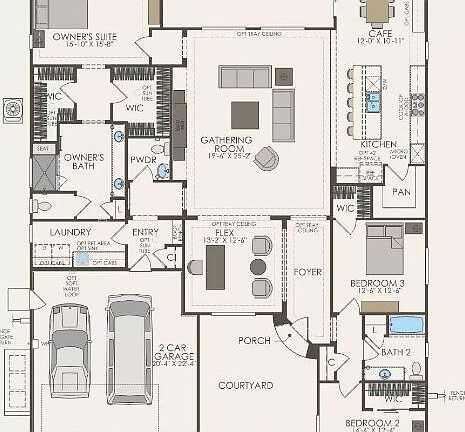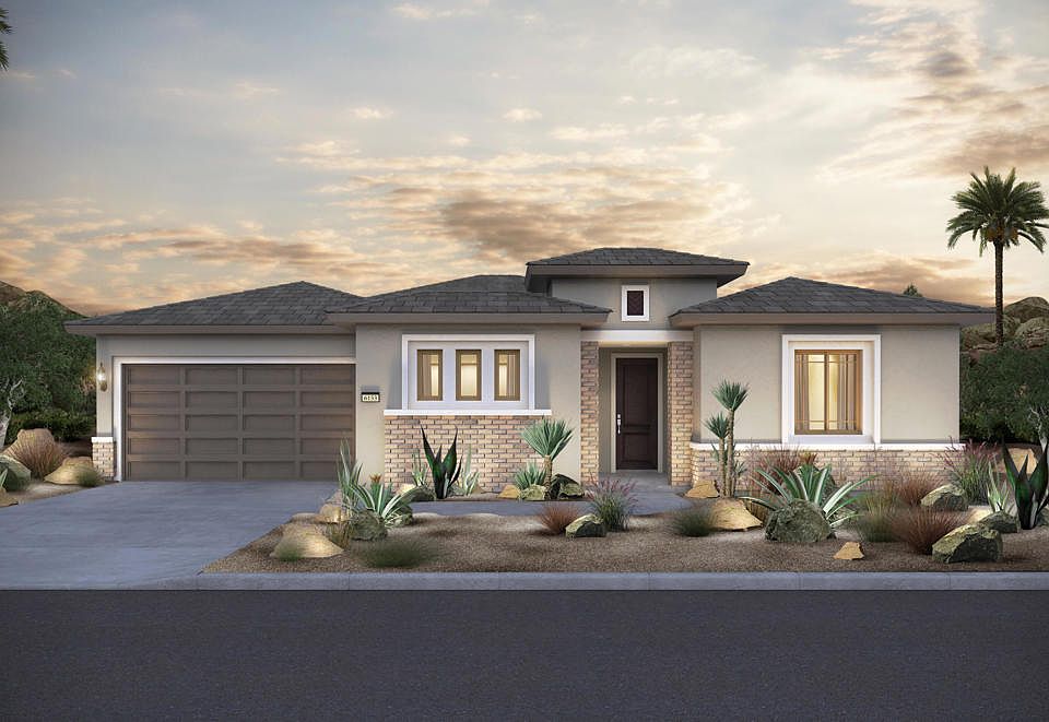 This is the Voyage Plan in the Encore Series at Del Webb Rancho Mirage. Offering an open-corner slider in Gathering room, interior fireplace, upgraded quartz countertops in kitchen,Southwest-facing home on walking trail,glass walk-in shower in Owner's Bath, guest rooms with en suite baths. Please note photos are of the model home. Floorplan rendering with furniture is for representation only and not included with purchase.