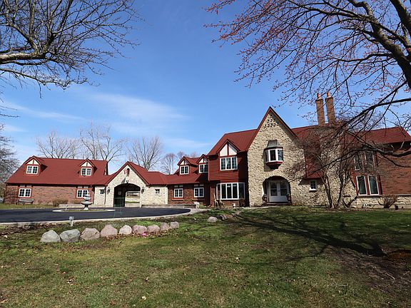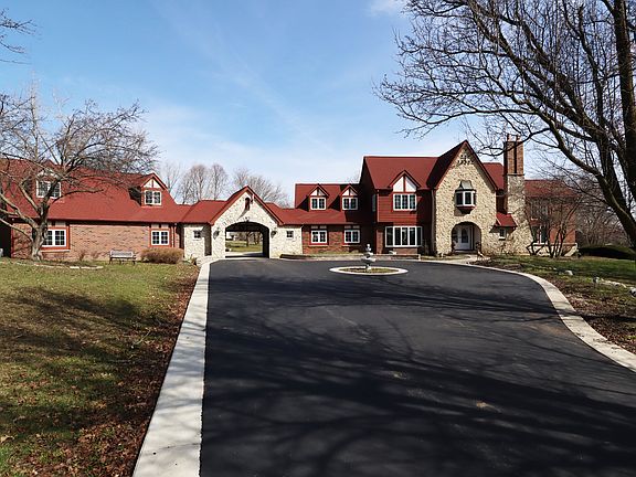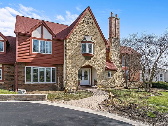 Magnificent estate nestled on a prime corner lot, boasting a majestic circular driveway that warmly invites guests into an unparalleled entryway. This residence epitomizes luxury living, featuring a breathtaking two-story living room adorned with a striking stone fireplace and a spiral staircase leading to a charming reading balcony. The expansive family room, complete with a second fireplace, seamlessly connects to a captivating great room that overlooks a serene pond, culminating in an awe-inspiring kitchen. Recently updated, the kitchen exudes sophistication with updated cabinets, countertops and great layout for the chef of the family. A convenient breakfast bar and a spacious walk-in pantry complement the space, which opens gracefully to a sunlit breakfast room. The adjacent elegant dining room effortlessly flows into the kitchen through a stylish butler's pantry. The main floor also boasts a refined office with custom built-ins and soaring volume ceilings, a well-appointed laundry room, and powder rooms for added convenience. Ascend to the second floor to discover a luxurious master suite complete with a sitting room, expansive walk-in closets, a double vanity, a Jacuzzi tub, and a full-body spray shower. Three additional bedrooms, adorned with gleaming hardwood floors, share a beautifully appointed hall bath. For added entertainment, the finished English lower level features a wet bar and powder room, ideal for hosting gatherings. Newer Roof done in 2016. The property also includes an impressive separate 8-car heated and air-conditioned garage, with 1,040 finished square feet above, boasting hardwood floors and a bath. Which serves as a coach home that is currently rented out. Enjoy the picturesque views from the gorgeous deck overlooking the tranquil pond, completing this truly exceptional residence.