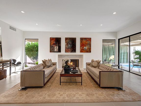 Your search for the ultimate home at Rancho Mirage's exclusive guard-gated golf course community of The Springs will end at this stylishly remodeled and upgraded residence. Showcasing the attributes of the popular detached St. Andrews floorplan, the single-level arrangement extends approximately 2,765 square feet and welcomes guests into a gated entry courtyard with refinished pool and spa and new Pebble Tec decking. Indoors, a free-flowing vibe and on-trend fixtures and finishes complement living areas that include a grand living room with fireplace and large windows framing pool views, a family room with walk-in wet bar, and an upgraded kitchen with white cabinetry, quartz countertops with a waterfall edge and breakfast bar, a bay window and stainless steel appliances. Three bedrooms and three fully remodeled baths are featured, with both secondary bedrooms opening to an atrium. The master suite hosts a private patio, walk-in closet, floor-to-ceiling sliding glass door, and a custom bath with stand-alone tub and rain shower. Enviable additions throughout the residence are led by quartz countertops, all-new flooring and paint, and wood and opaque-glass interior doors.