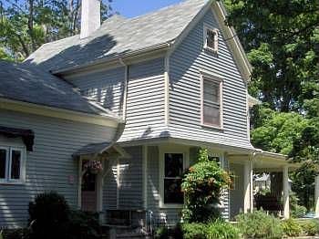 Wonderful village home on a quiet residential street, lovingly maintained and updated for energy effiency. Rambling kitchen/great room with new slate and cherry floors, ceramic countertops, and gas heating stove. First-floor bedroom with adjouning full bath, dining room with bay window, front parlor, restored hardwood floors. Wraparound front porch, private deck, walk-up attic. Large corner lot, about one-half acre enclosed by a handsome stockade fence.