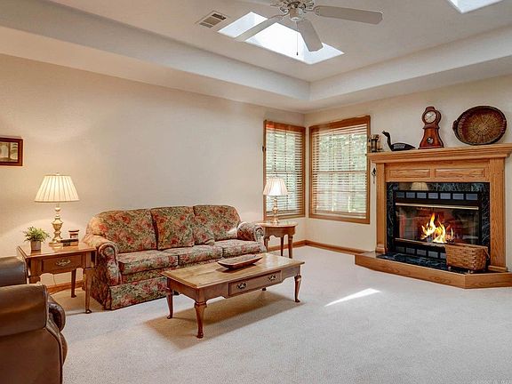 BRIGHT AND PEACEFUL HOME WITH WOODED VIEWS! 3bd, 2ba inviting home offers plenty of natural light with it's skylights and generous windows - giving you beautiful wooded views throughout. Open floor plan, with a formal dining room and breakfast room, is perfect for everyday living and entertaining. Dining room and sunroom open to the back patio. Enjoy cozy evenings by the fireplace in the living room which has tray ceilings and skylights for a spacious feel. Kitchen has pass through window to the sunroom and it's own skylight. The master bed has tray ceilings and master bath has walk-in shower and soaking tub. Relax on the patio, where you’ll enjoy uninterrupted views of nature as there are no neighboring houses behind. Great as a full-time home or STR. Easy access to the Village's amenities- including fitness center, library, tennis courts, lakes, scenic trails, etc. Just 25 minutes to Downtown Hot Springs, Bathhouse Row, shopping, restaurants, and National Forest. This home offers privacy, serenity, convenience! COME AND SEE! Agents - please schedule all showings with Showing Service.