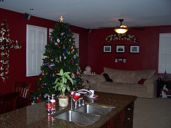 Large downstairs master bedroom, updated master bath, walk in closet with built ins. Accent Rock wall in master. Ceiling fans in every room. Travertine flooring throughout downstairs. Accent wood wall in living room and on island in kitchen. Large kitchen granite Island. Large Sunbuster' patio cover with lighting and fans in fully landscaped backyard. Built in salt water Pool with removable fence. Fire pit. Large loft upstairs.