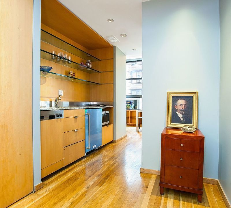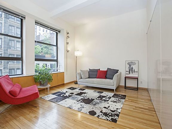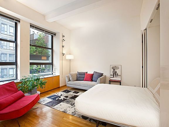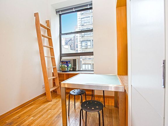 Come discover this gem in the heart of the Flatiron District! Prewar Loft building with 24-hour doorman, on highly sought-after prime block. Mini-Loft features 11' beam ceilings and huge south facing windows, enjoying all-day light and lovely views on the most sought after tree-lined block of Flatiron. Choose between queen sized murphy bed in main living area, or a junior 1-bedroom layout with separate sleeping area. Well-crafted built-in wood cabinetry & shelving throughout. Kitchen with beautiful glass shelving, granite countertop, brand new stainless mini-fridge, custom cabinetry and pantry. Wall to wall tile and glass bathroom, with very spacious walk-in shower and multiple shower heads for spa-like experience. Smartly planned layout and design maximizes the use of space and provides amazing storage. Versatile and comfortable, this space has truly perfected Mini-Loft living! Contact Resident Specialist for more info. About 21 E. 22nd Street: Centrally located with easy access to transportation/subways, parks, fabulous restaurants and shopping such as Eataly, Whole Foods, Trader Joe's, Union Square Farmers' Market, and Madison Square Park. This well-established Pre-War Co-op is beautifully maintained, a truly unique residential full-service loft building in the historic & convenient Flatiron District. 24-hour Doorman and Live-in Super Gorgeous Common Planted Roof Deck Laundry on Every Floor Pet-friendly Storage and Bike Room in Basement Pied-a-terre and Guarantors allowed