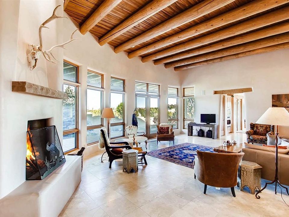 This elegant home is thoughtfully designed around a spacious great room with tile floors, fireplace with stone mantle, large windows which frame views to the west and the Jemez Mountains, soaring ceiling with vigas and latillos, and a charming wet bar. Glass doors lead to two delightful portals. One is an enclosed courtyard accessed from either the kitchen or the great room and has a built in gas grill, lawn, gardens and a covered dining portal and boasts wonderful views to the north and the Sangre de Cristo's. This is a comfortable space to gather and share a meal with friends and family on summer and fall evenings. The other is the grand portal which wraps around the western part of the house expands to a deep patio perfect for enjoying glorious Santa Fe sunsets. The kitchen has been updated with granite counters and a kiva fireplace. The master suite is well separated from the guest wing and contains an attractive office or studio that has views to the west and direct access to the grand portal. The master bath offers a large tub, walk in shower, double vanity and walk in closet. Two of the three secondary bedrooms have en suite baths providing guests and family both privacy and ease of living. The home is completed by an over sized three car garage providing wonderful storage space. This remarkable property is conveniently located within Estates III at Las Campanas and is perfect for everyday living or as your Santa Fe retreat.