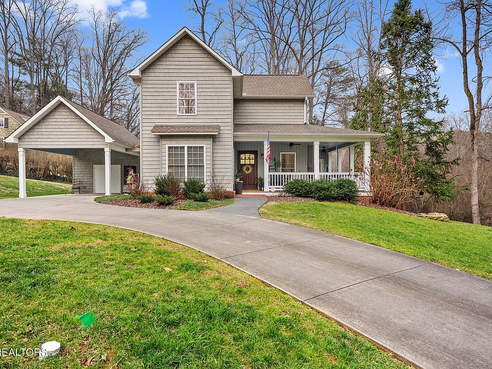 Gorgeous home available in the heart of Norris, offering the rare combination of newer construction with the character and charm of a true old soul. From the moment you arrive, the wraparound covered porch invites you to slow down and take in views of the sprawling yard, framed by mature trees and wooded surroundings- a setting that feels both peaceful and rooted in the historic fabric of the community. Built and designed by Irwin Construction, this home comes with many quality and detailed finishes. Inside, a focal brick fireplace anchors the hearth or dining area, creating a natural gathering space that flows effortlessly into the bright, airy kitchen. Thoughtfully designed with stainless steel appliances, beautiful cabinetry, and an island with a sink and seating, the kitchen is both functional and welcoming. Natural light fills the home throughout, and tucked just off to the side is a cozy family room with built-in shelving. The primary suite is conveniently located on the main level and features an ensuite bath with double vanities, built-in storage, a walk-in shower, and a generous walk-in closet. Upstairs, you'll find two guest bedrooms, a full bath, and a private office space, offering flexibility for guests, work, or hobbies. Outside, the covered parking pavilion provides sheltered parking along with additional storage for outdoor gear and equipment. Truly a unique home in a wonderful community, just minutes from Norris Dam, Norris Lake, and all Norris community amenities- with the added convenience of an easy 25-minute drive to downtown Knoxville.