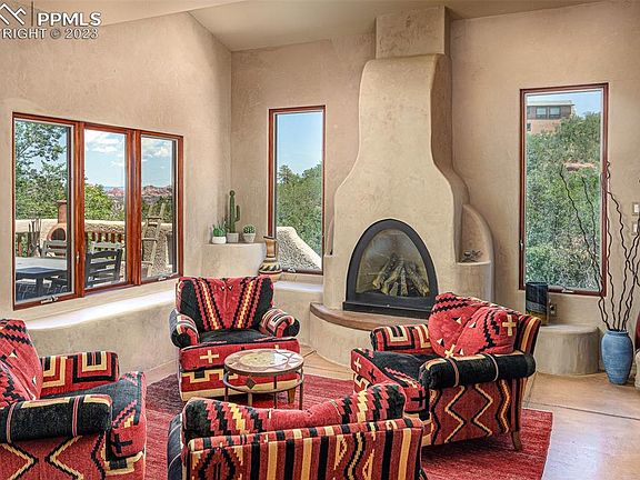 A Manitou Springs dream fulfilled! This stunning Santa Fe style beauty in Manitou Springs will leave you in Awe! Gorgeous Craftsmanship is apparent from every perspective, including the inspiring southwest style architecture, to the exposed beams & hand-molded kiva fireplace. The home is walking distance to Manitou Springs featuring restaurants, shops, wine bars and more. And, you are only a 10 min, drive to COS. But the best part, is you are tucked away in a discreet nook that provides for such privacy & serenity you would think you were living in Neverland. Nestled by a canopy of trees & wrapped in views, this is a Manitou you haven't before seen. Enjoy the beautiful mountain breeze from any of the 5 amazing decks where you can soak in the sunshine & panoramic views of the mountains, trees, rock formations & skyline. In the evening, relax on the wrap-around patio, chasing the sun as it fades into dusk. Inside, explore 5 spacious bedrooms, each ensuite for an extra layer of privacy & luxury. Enjoy a Primary suite on the main, for all 'main level' living or stroll upstairs & appreciate a second Primary w/ a jetted soaking tub & private balcony. The Kitchen is spacious with upgraded appliances, a large breakfast/entertainment bar and an attached dining space with room for everyone. You have 2 walk-outs from the kitchen so you can dine in, or dine out and change up your view w/ every meal. The cozy living room w/ a kiva fireplace, floor to ceiling windows, and a main level family room w/ yet another balcony to enjoy, completes the main floor. The lower level features 4th and 5th bedroom suites, a second family room and wet bar, possible pool, game table area w/ a bonus space and a sauna that leaves you with the perfect feeling of namaste. Upstairs features 2 elegant suites, both with private decks. You can't find a more beautiful, welcoming and scenic home in all of Manitou Springs. Furnishings are negotiable, pool table and pellet grill are included