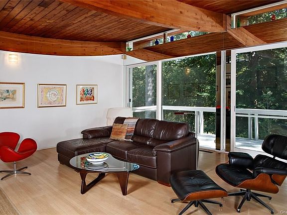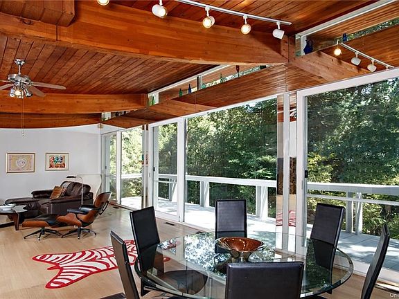 Nestled on almost 7 secluded acres, up a long driveway, sits this stunning one of a kind Mid-Century Modern home. This architectural gem boasts wood beamed curved ceilings and walls of glass throughout. Every effort was made to minimize the border between inside and outside. Each room offers scenic views and access to the wrap around decks. You will feel like you're on vacation every day. The open flow from the kitchen to the living room makes for seamless entertaining. Spectacular 20x40 inground pool and private setting add to the beauty of this home. Elevator provides easy access to the upper level. Fabulous Southern Dutchess location, 70 minutes to Manhattan, private yet close to all the Hudson Valley has to offer. Come and fall in love.