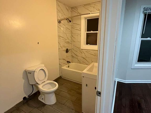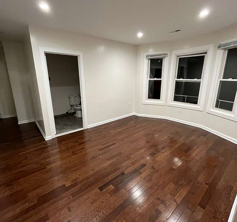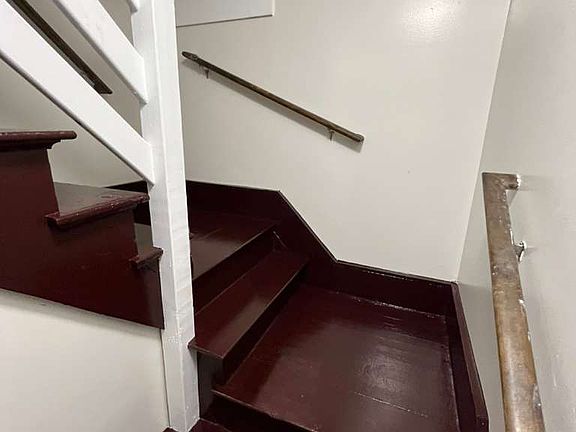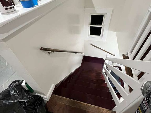 Interior highlights include multiple spacious bedrooms, a large main living area with bright windows, and an updated bathroom with modern tile and a new vanity. The unit has been thoroughly cleaned and painted, presenting a clean, move-in ready condition. Access is via a charming internal stairway with bold maroon-painted treads. Off-street parking is typically available. The location boasts a "Very Walkable" score with nearby dining and is close to local amenities like CTown Supermarkets and major parks such as Hubbard Park.