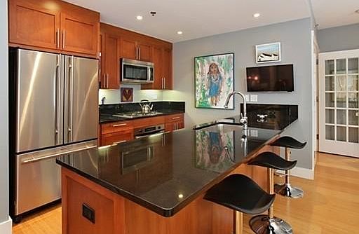 Pristing south-facing unit at The Penmark Residences features an open living/dining area with custom lighting and built-in bookcases. The chef's kitchen, with stainless steel appliances, granite countertops, and a breakfast bar, opens to the living space. The room off the living area can be used as a den/office/nursery or the French doors can be left open to expand the living area.The spacious master bedroom is enhanced with a marble-appointed bathroom and a balcony which overlooks a beautiful private green space. Also offered are a half bathroom, an in-unit washer/dryer, California Closets, bamboo flooring throughout, and additional storage. Elevator access to a prime garage space (#219) is included in the price. The Penmark, formerly Boston College, was converted into luxury condominiums in 2007 and is well-maintained with a high reserve fund (as of July 2015). Residents enjoy access to a recently renovated gym, concierge services, and close to hip South End restaurants.