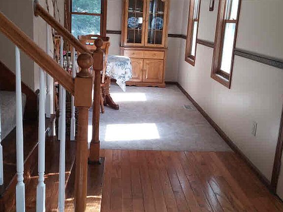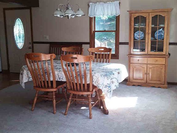This home has been updated with fresh neutral paint throughout entire inside; all new carpet, including 10 pound pad underneath, some hardwoods; large dining room for gatherings; functional floor plan w/easy flow; bathroom is updated with new bathroom tiles and attractive granite vanity, beautiful open concept kitchen, updated kitchen, central air conditioning, wood stove, wood fireplace, cedar deck, 1st floor laundry, Aprilaire Humidifier home solution for total comfort through humidity control of dry/stale air, new water softener/filtration system, new roof installed in 2010; finished room in basement for office/recreational room, the outside has lovely mature plantings; fruit trees that include peach, apple, and plum trees surrounding this Cape style home.