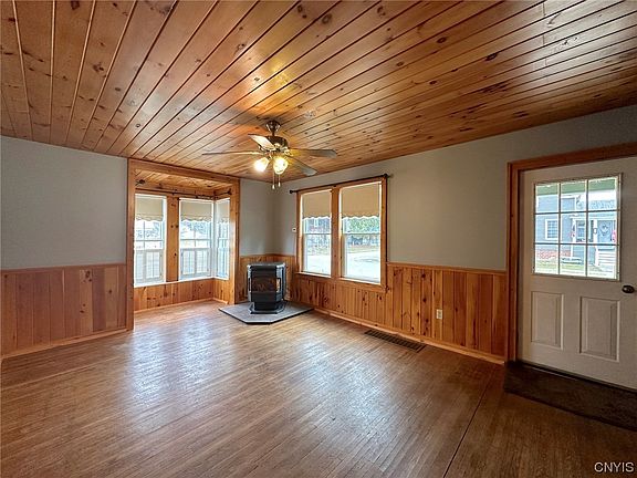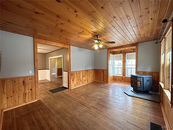 All offers due Sunday, March 26, 2023 by 5:00 PM. Charming 3 bedroom home that is move-in ready and is located in Cuba NY. Enter this home into the living room which has tongue and groove ceilings and half-walls, a bay window and a pellet stove. Also, the living room has hardwood floors that continue into the dining room. The dining room has an adjoining room that would be great for an office and this room leads to one of the bedrooms. Off from the dining room is a covered porch. The kitchen has concrete countertops, plenty of cupboards, and comes with all appliances. A full bath and laundry-mudroom complete the lower level. The second level has two good size bedrooms. One of the bedrooms has an attached bath that will need new plumbing. The total square footage of the home is 1,584.