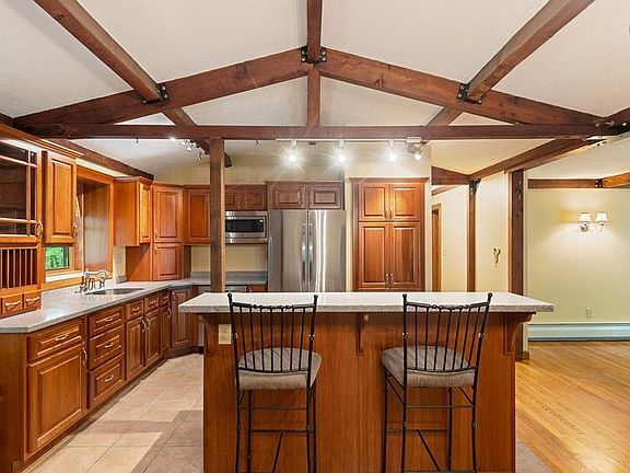 Ranch style home with Farmers Porch tucked privately on 1.2 +/- acres. An open floor plan with cathedral beamed ceilings: * Kitchen has cherry cabinets, solid surface counter-tops, center island, brand new stainless appliances and tiled flooring * Living Room with hard wood floors, wood stove and atrium doors that walk out to deck and secluded back yard. * Dining area with hardwood flooring - all perfectly situated for gatherings. Master Bedroom suite with full bathroom and lots of closet space - hardwood flooring and beamed ceiling set privately from main living area. After a long hard day enjoy the custom-built sauna in the lower level. Basement is walk out and could be finished for additional space. Located close to rte. 140, 2, 2A, Mt. Wachusett recreation, T-Station.