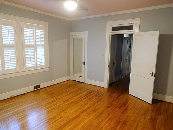 Available early October. Min. 600 credit score required to qualify. Lovely one story historic home;located on a short side street. 9 foot ceilings, transoms over the windows, plantation shutters, split floor plan with wide entry way, very large den, and completely glass climate controlled sun room, Kitchen with custom cabinets to the ceiling and built in storage, extra large den with bookcases solid wood flooring and walls, Floor to ceiling built in cabinets in master bedroom wing, separate entrance to master wing, lovely arched double entry door between formal living room and dining room, fireplace. Gas tankless water heater. Lawn Maintenance is included in the rent. Shed available for extra storage space.