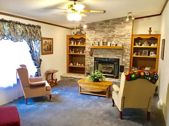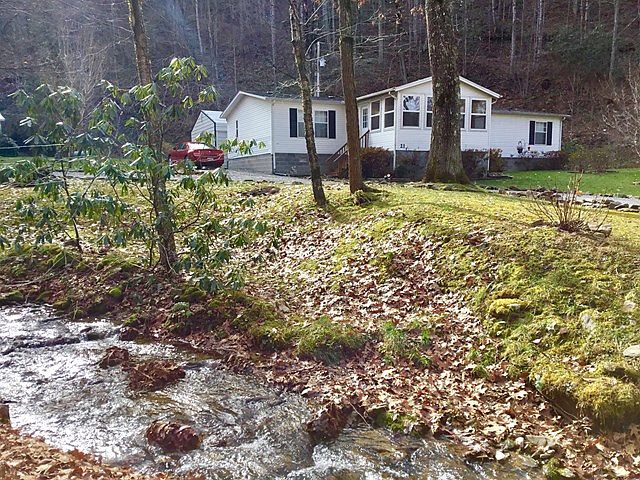 An outdoors-man' s paradise to live creek front on a trout stocked stream. This 1998 doublewide home has lots of "extra's" to make it extra special. Home features a huge sunroom where you can sit and listen to the creek, a 2-car detached garage with a workshop area, a Generac system, a family room with a nice gas fireplace, a den & and a nice flat yard. Spread out with 2 bedrooms and 1 bath on one end of the home and the master & bath on the other end. New metal roof in 2018. New HVAC system in October 2023. Unrestricted!