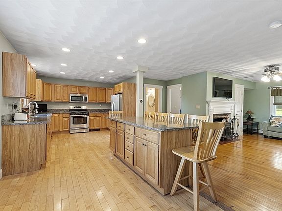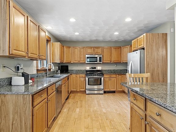 This beautifully designed 3,350 sq. ft. home blends comfort, space, and flexibility. The main level welcomes you with a modern kitchen featuring stainless steel appliances and a generous island, opening to a warm living area with a wood stove. A sunroom, formal dining room, mudroom, guest bedroom, and full bath complete the first floor. Upstairs, the serene primary suite boasts a walk-in closet and spa-inspired bath. Two additional bedrooms, a full bath, and laundry add convenience. The top floor offers three adaptable rooms—ideal for a home office, gym, or extra bedrooms. The finished lower level includes a full bath, office space, family room, and interior garage access. Outside, enjoy the charm of a large porch, mature gardens, and trees. Just minutes from schools, trails, town center, and the commuter rail. A versatile home with room to grow!