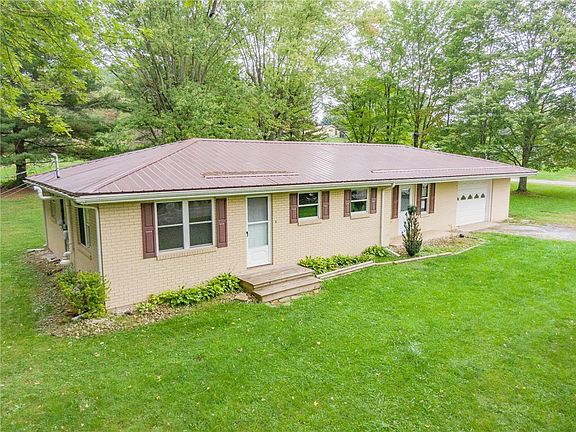 Sprawling country brick ranch on a level lot. Low maintenance exterior features a metal roof. Enjoy the sunporch as a relaxing spot to sit. Formal dining room off of the huge kitchen. Living rooms is very spacious. Two bedrooms and full bath complete the main living area. Attached garage has a half bath in it for convenience. Garage will likely fit more than one car. Easy commute to Punxsutawney, Brookville and New Bethlehem.