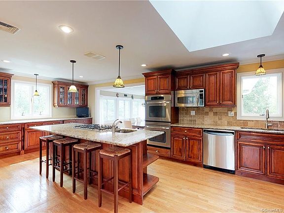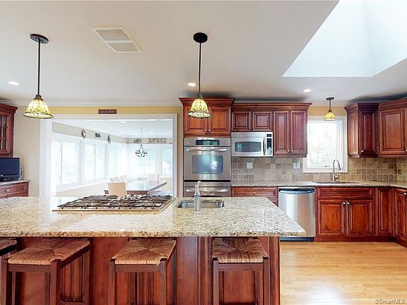 Custom and expanded with very attractive curb appeal, covered front entrance with large pillars. Conveniently located in the Tashua section of town close to schools, parks, shopping, and highways. This home has recently been renovated. Huge eat in kitchen that offers an abundant amount of cherry wood cabinetry, granite counter tops, Italian tiled back-splashes, and stainless steel appliances. Large center island with gas cook top and dishwasher. Extremely sun filled home with walls of glass and windows, some palladium. Off the kitchen you step into the DR/sun-porch, living room with huge bay window, crown and chair-rail moldings, recessed lighting throughout home, Newly renovated custom tiled baths, double sink vanities, granite counter-tops, over-sized shower stalls, and spa tub. Enormous master bedroom with tray ceiling, large walk in closet, and luxurious bath. Four other generously sized bedrooms. Lower level family room offers a full wall, floor to ceiling natural stone, wood-burning fireplace, wet bar, and recessed lighting, full bath, laundry, and a possible in law/ Au pair. Level, private, rear yard.