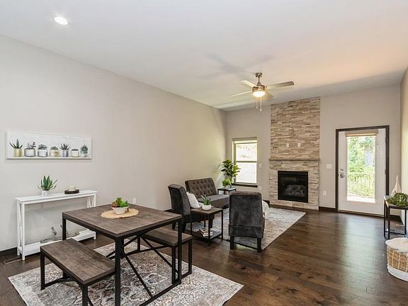 Hard to find ranch style condo for easy living with all the upgrades. This home has been barely lived in, and on top of hardwood floors, SS appliances, granite counters and high ceilings, the owners have added so much more! The open floor plan main level has designer touches from the entry, to the high ceilings and floor to ceiling stone around the fireplace. The kitchen has been updated with roll out shelves and under/over cabinet lighting. In the spacious primary bedroom, the additions include pocket doors to the the primary bath and walk in closet, beautiful tile work in the shower with new cast iron base and glass doors, and upgraded shelving in the closet. There is an additional bedroom and full bath on the main. Downstairs you will find a huge family room, another large bedroom and 3rd full bath. The large utility room is big enough to house your hobbies, treadmill or your extra stuff! The water heater was replaced in 2022, whole house humidifier added and the water softener stays! Custom window blinds/shades have been installed throughout. Outside you'll find a freshly stained deck with added stairs to the yard on this end unit home with a private wooded feel. Additional updates include egress railing, upgraded front storm door and screen in back. This beautiful home is ready for you!