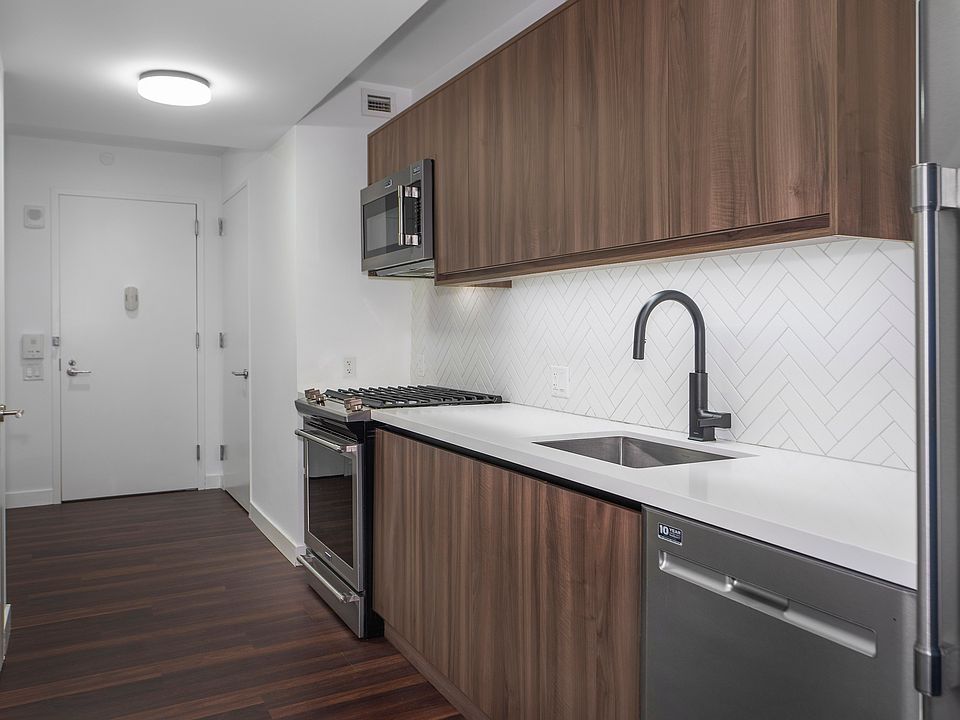 Our gorgeous apartments exude elegance, with striking matte black fixtures, wide-plank hardwood flooring, and charming built-in features. Savor decadent meals prepared in your fully equipped gourmet kitchen, complete with stainless steel appliances, and a gas stove. Dark wood cabinetry provides the perfect contrast to stunning white stone countertops and a striking herringbone tile backsplash.