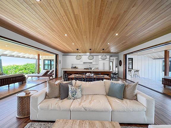 The expansive common area includes a large kitchen outfitted with several stainless steel appliances and a large countertop with barstools for any chef to feel fully comfortable in their culinary element while entertaining guests. Overlooking the kitchen is the dining table with seating fit for 8, as well as the living area with a plush couch and flatscreen television. Flowing seamlessly from the common area through the open face doors is the large covered lanai (porch) with a variety of chaise lounge chairs and tables overlooking the lush flora on the lawn as well as the ocean beyond. It is the perfect place to spend the day soaking up the tropical sunshine, or to relax at the end of the day watching the colorful display of the Hawaiian sunset. Around the corner of the home you'll find the large private swimming pool with deep and shallow water levels surrounded by an array of tropical plants.