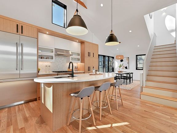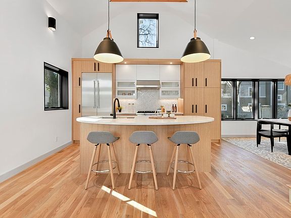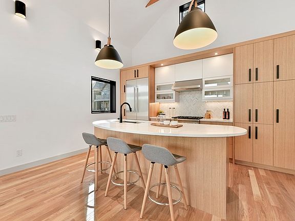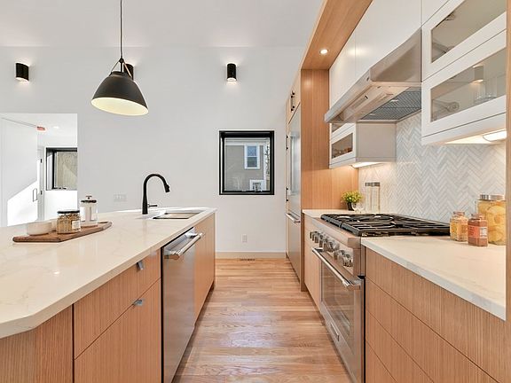 The stunning gut renovation of this single family has created a modern residence suitable for contemporary living with an airtight fully insulated building envelope. The first floor features an open living room with 2 story cathedral ceiling. This airy, elegant space accommodates generous living and dining areas, while glass doors open to the private deck, patio, and landscaped yard. Beautiful chef's kitchen with custom-built white oak cabinetry, quartz countertops, expansive island/breakfast bar, and professional appliances.This level features a large bedroom with an en-suite bath and built-in closets. Upstairs, another gracious suite with a rounded 12-foot vaulted ceiling flanked by large circular windows, and a gorgeous en-suite bath. This house offers the choice of a primary suite on either the first or second floor. On the lower level find a large media room with great natural light, bedroom with a full bath, extra storage, and a laundry closet. Includes driveway parking.