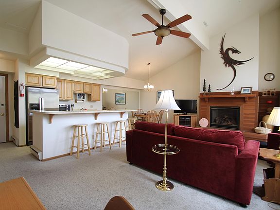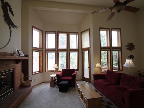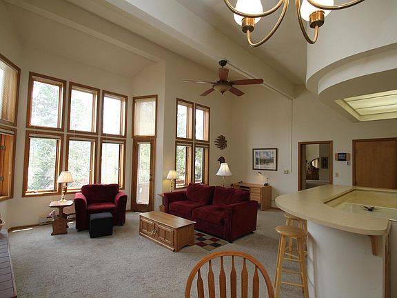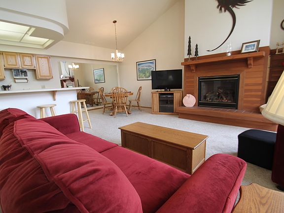 Sunny penthouse with vaulted ceilings, steam shower, jetted tub and elevator access. Three exterior storage closets, one interior storage, and carport. Lots of windows, two gas fireplaces and ceiling fan. Easy living,rental potential, full time resident or second home with room for all kinds of toys. Easy access to movie theater, bowling alley or rec center and miles of trails.