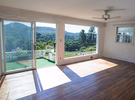 This is a unique property with a "walk to town location" and a view that takes your breath away. Located on the hill above town this single home property is actually three building lots, that if designed with care, each home could have that breathtaking view. Or, keep the property whole and enjoy acres of private wooded property close to town. The hilltop cottage style home is move-in ready. It has town water and sewer. It has two bedrooms, one full bath, living room, eat in kitchen and a beautiful country style wood paneled sun room, as well as, a full basement and an attic. It includes decks on three sides of the home to take advantage of the location and views. It sits on a total of 4.4 acres with a blacktop driveway, two car garage, shed and solar panels