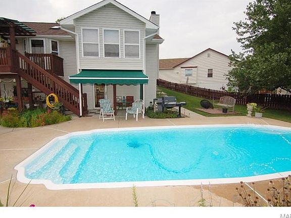 Enjoy the Summer days in your own in ground pool at this OFallon MO. Home that is just minutes from all 3 major highways. This 3 bedroom, 3 bath ranch home on a cul de sac has a walkout basement and plenty of upgrades beginning with granite counter tops, upgraded cabinets, 2 fireplaces, enclosed porch, deck and patio, fenced yard, outdoor speakers, newer pool pump and heater, brand new HVAC 14 Seer air conditioner and heater, several bay windows, built in wood shelving, and a hearth room with a wood burning fireplace. The master bedroom has a bay window, and dual vanities and jetted garden tub in the master bath. The lower level has a full kitchen, workshop, bathroom and it is plumbed for a steam room. There is an outside storage area, gas BBQ pit, walk in closets, can lighting, central vac system, fresh paint and new carpeting. Give me a call to see this home before its too late.