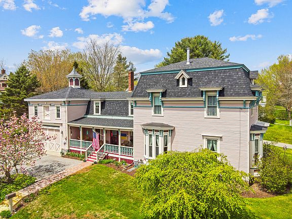 In 1873, local merchant Edgar Stackpole, built this elegant Mansard-style Victorian to graciously welcome family and guests to the heart of Thomaston, Maine. The current stewards upgraded many features and carefully designed the whimsical color scheme drawing you onto the comfortable sitting porch and beckoning you inside to the grand rooms. The extra tall ceilings on both the first and second floors accentuate the cozy rooms while an abundance of windows washes the home with natural light. Authenticity is mixed with modern features including a new custom kitchen with first floor laundry, interior access to the large 2-car garage and a first-floor primary bedroom with a walk-in closet and private entry to the full bathroom. Throughout the period light fixtures, large wood interior doors, moldings, trim, and wood floors maintain original beauty honoring the rich history of owners and historical events since the late 1800's. The stunning front staircase leads upstairs to a wide-open hallway and two large guest bedrooms. Another sunny hallway leads you to the back of the house to two smaller bedrooms, well suited as office or den spaces. Above the garage is a large open, unfinished loft area, perfect as a maker's space, art studio or finished living space to suit your lifestyle. Mature perennials and flowering trees decorate all sides of this elevated lot with private driveway and large garage. Best of all, you are located in the heart of town just one block from Thomaston's ever emerging Main Street shops, restaurants, and services and to the far southerly end of Knox Street the wide-open expanse of the St. George River. In this neighborhood you are surrounded by many lovingly maintained historical homes that carry the spirit and character of Thomaston's unique merchant and shipbuilding roots. 21 Knox Street exudes charm and offers modern functionality - two worlds in one very tempting package.